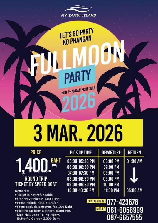 • Speedboat to the full moon party 2026. Boat time is at19.00 pm.Including Round trips Hotel Pick-up 18.00 - 18.30 Pm.Start Time: 19:00