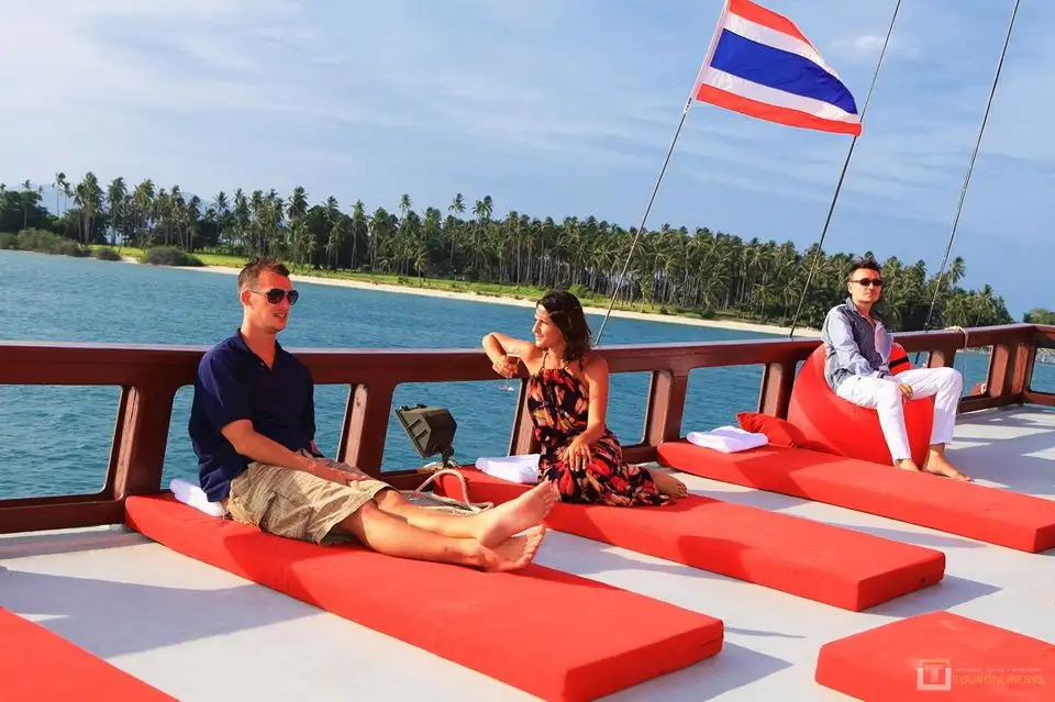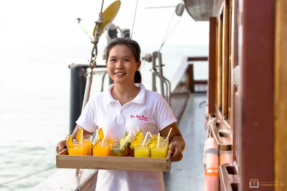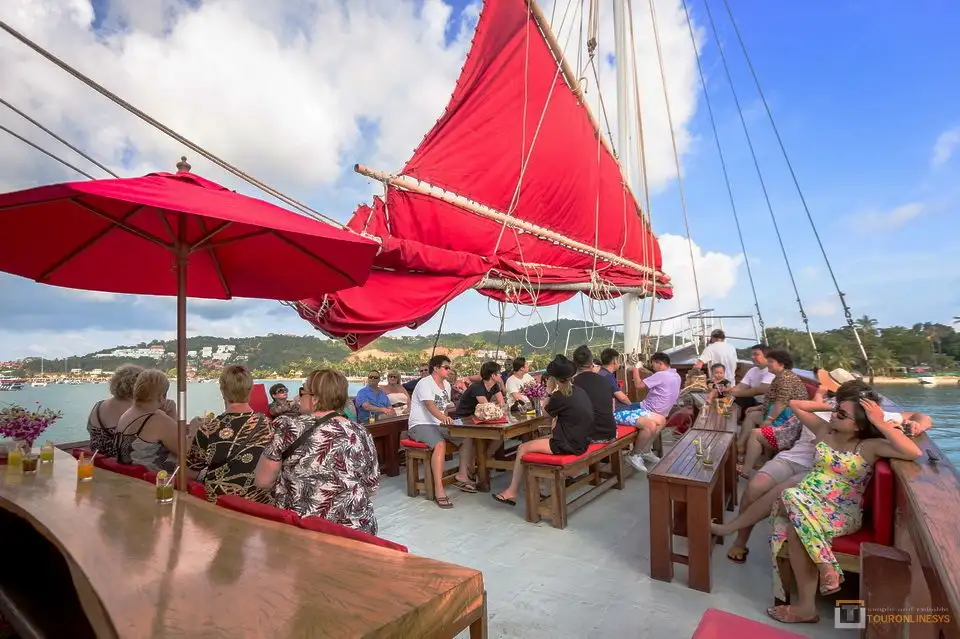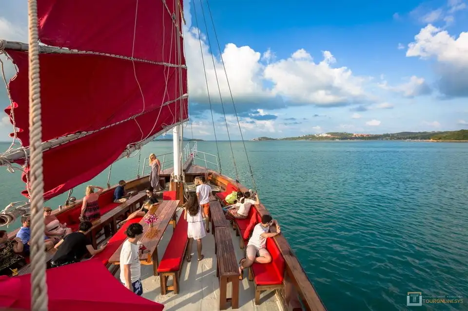Welcome to Junk boat a 99-foot (30-meter) long yacht for this Sunset diner cruise, which kicks off with a complimentary cocktail. You’ll enjoy an endless Sunset dinner as you cruise along, a ship with Thai-style sails. Soak up the sun on the open-air deck and enjoy whiskey and wine in the covered saloon. Heading to Koh Som, a small island just off-shore from Koh Samui, with its beautiful beach and the limestone formation.