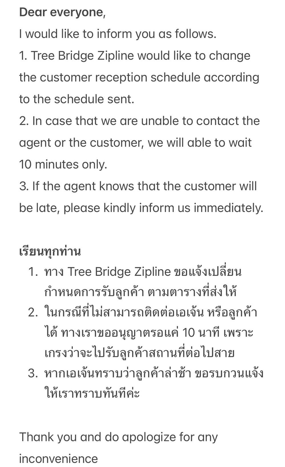 1. Tree Bridge Zipline would like to change the customer reception schedule according to the schedule sent.
